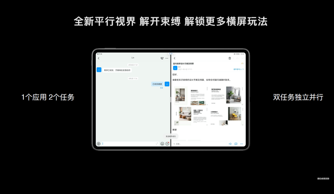 在单个应用下,平行视界可以利用屏幕左右两侧的空白区域进行上下滑动,让交互更贴心。在左右分屏状态下,让左右屏同应用的两个窗口任务并行操作,能实现两个任务同时独立运行,可以一边使用微信沟通,一边刷朋友圈,让操作的效率得到提升。