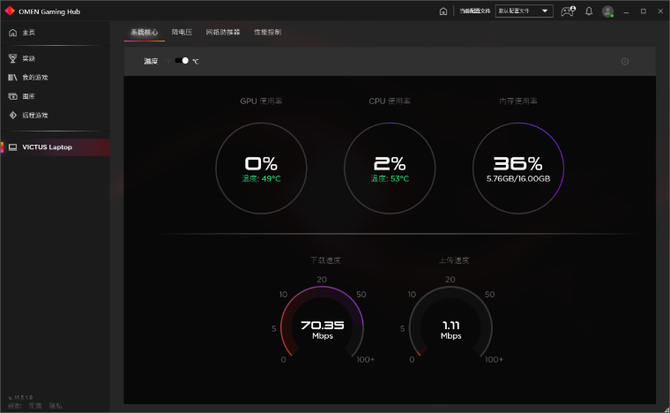在游戏控制中心里,还有系统核心、降电压、网络助推器和性能控制等功能。系统核心主要显示了笔记本当前核心硬件的占用率,一目了然。