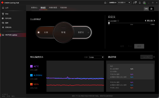 这里主要说一下降电压,降电压是指在不降低CPU性能的情况下,降低CPU核心电压从而减少发热。比如在某些大型游戏或者图像渲染的时候,担心CPU长时间大负荷运行会带来的功耗和散热压力,但是同时又不想牺牲性能,这个时候就可以使用降电压功能。这个界面有关闭、智能和自定义三个模式,智能是可以自动调整降压的模式,小白玩家也能轻松操作。自定义模式则适合比较资深的玩家,可以手动调整核心电压的偏移,相当于DIY超频的设置,在使用自定义时,可以逐渐尝试,而不是一次到位,如果遇到系统不稳定,则反向调整至稳定即可,这个过程也会有几次确认,甚至是系统重启。