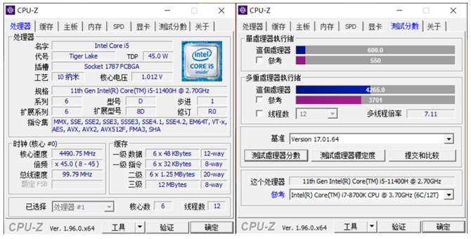 使用常用的CPU-Z基准测试,最终成绩单核得分600,多核得分4265,相同对比下,均超过较早时期的i7-8700K处理器跑分。