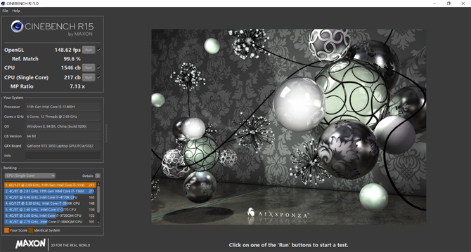 在CINEBENCH R15是比较早、也是比较经典的处理器计算能力的测试工具,单核成绩217cb,多核成绩1546cb。