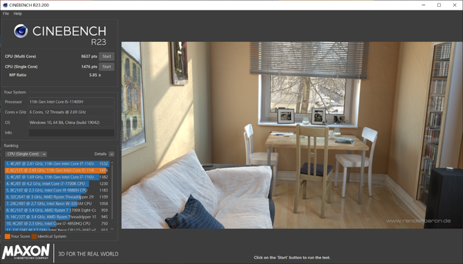 CINEBENCH R23相比R20的测试过程基本是一样的,测试的成绩也只是倍数的增加。单核成绩1476pts,多核成绩8637pts。