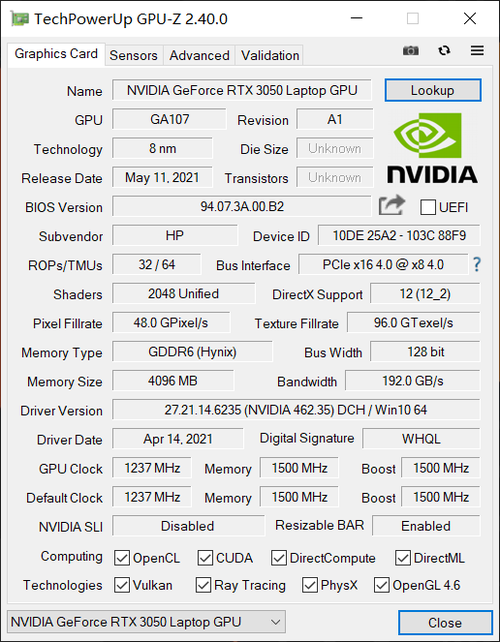 作为RTX30系列的甜点级显卡,GeForce RTX 3050 Laptop GPU将有可能成为轻薄高性能游戏本的标配,这款显卡采用了GA107 GPU核心,基于三星8nm工艺打造,拥有2048个CUDA核心,其中包含64个Tensors和16个RT内核,频率为1057~1740MHz。此外还配备128bit位宽GDDR6显存,4GB容量。支持PCIe 4.0以及HDMI 2.1输出,支持光线追踪技术、DLSS超采样技术以及NVIDIA Reflex低延迟模式,能够满足主流用户流畅运行较高要求的游戏和应用程序,并通过专有算法提高分辨率和帧速率。