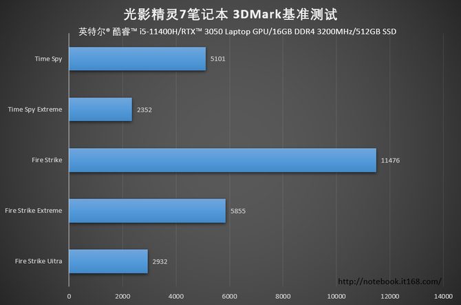 在最新版3DMark的测试中,Time Spy的得分为5101,Time Spy Extreme得分2352,Fire Strike得分11476,Fire Strike Extreme得分为5855,Fire Strike Uitra得分2932。需要说明的是,在我们测试这款笔记本的时候,由于RTX 3050显卡的驱动还没有补齐,所以光追部分的测试暂时缺失。