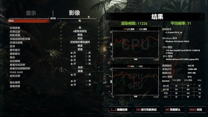 在游戏《古墓丽影:暗影》的测试中(暂时无法开启DLSS),影像模式为高,渲染帧数11226,最终平均帧率为71fps,达到很流畅水平。