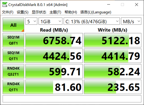 使用CrystalDiskMark测试,顺序读取速度达到6758.74MB/s,写入速度5122.18MB/s,妥妥的旗舰级水平。如果你只是觉得512GB的容量不够用,这款笔记本还预留了NVMe M.2接口,双SSD足够了。