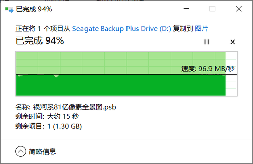 验证一下写入的速度吧,拷贝一个约25GB的大型文件,平均速度96MB/s,而且非常稳定。