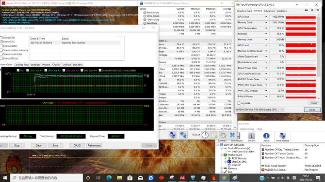 之后使用AIDA64和FurMark进行双烤,连续运行26分钟,GPU温度约80°C,功耗75.9W,同样达到了满功耗状态,不得不说,光影精灵7的散热设计相当给力了!