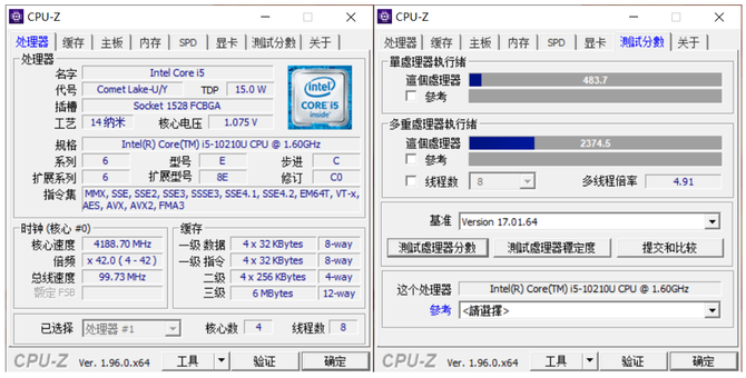 使用CPU-Z基准测试,单核成绩达到483.7,多核成绩达到2374.5,毫无疑问在单核成绩上,这款CPU还是比较亮眼的。
