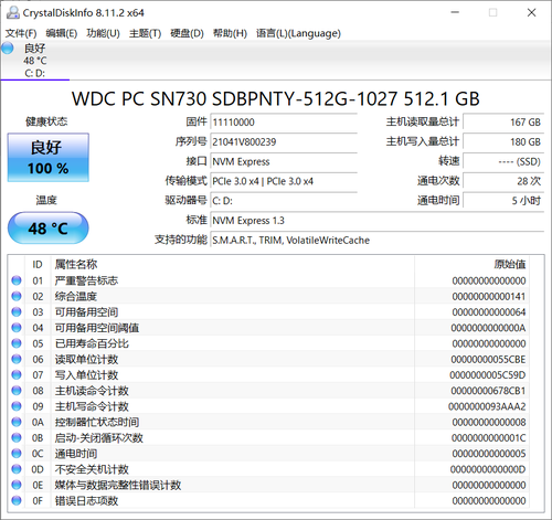 我们评测的这款荣耀 MagicBook X14搭载了一块WDC西数SN730黑盘SSD,512GB,NVMe标准,对于容量可以满足日常办公文件的存储,如果还有大量图片、视频素材,用户可以使用外接硬盘的方案进行存储,毕竟这台笔记本还有Type-C和USB 3.0接口,数据传输的速度能够保证。