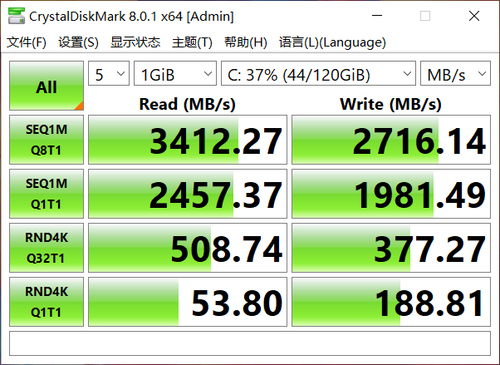 使用CrystalDiskMark对该硬件的读写速度进行检测,最终可以看到读取速度达到了3412MB/s,写入速度达到了2716MB/s,即便是数个GB的文件,也能数秒传输完成。