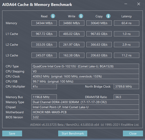 内存方面采用的是板载设计,16GB DDR4 2400MHz,读取速度为34344MB/s,写入速度为34880MB/s,Copy为30640MB/s,时延仅60.4ns,整体处于中端偏上水平。