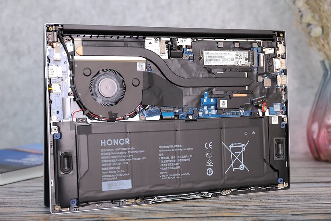 要想性能持续而稳定的发挥,散热设计同样是整机最为重要的一环,荣耀 MagicBook X14的散热出口位于转轴处,对用户操作时的体感更为友好。内部单导热管宽度和厚度都很足量,鲨鱼鳍高密度纤薄大风扇,S形扇叶设计,以及对整机系统化散热和风向定向的优化,提升散热风量的同时还确保了整机在运行时的静音效果。
