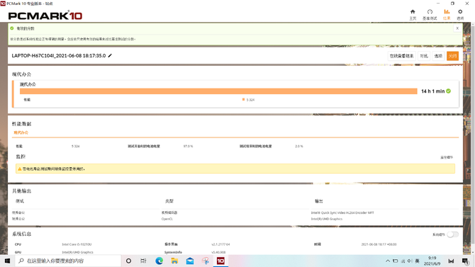 这款笔记本内置了56Wh锂电,我们使用PCMark 10的现代办公场景,对该笔记本进行电池续航时间的测试。测试前电量为满电,之后将屏幕亮度调整至60%不影响正常使用,系统电池设置为更长的时间,保持无线、蓝牙、定位的开启,最终获得14小时的超长续航,外出携带再也不用担心电量不够了。