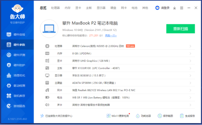 通过鲁大师的硬件识别,我们可以看到这款笔记本的全部配置,四核心的处理器在应对大部分的日常场景,完全没有任何问题,同时蓝牙和无线网络连接,方便我们的日常使用,同时还有6000mAh大容量电池,保证我们的整机续航,长时间外出办公,也能够轻松应付。