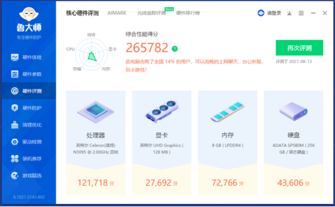 鲁大师整机测试的分数为265782,这样的成绩表现较为不错,不论是日常视频,PPT还是Word、选课等应用,都能够轻松应对,毫无压力,同时固态硬盘也能够实现更快的开机速度和系统响应速度,日常使用,不会感受到明显的卡顿现象。