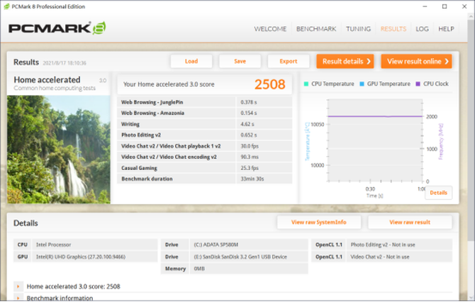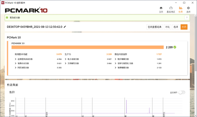 PCMARK是一款测试整机综合性能的软件,在测试过程中,攀升MaxBook P2表现稳定,在PCMARK8家庭性能测试环节中,我们可以看到,攀升MaxBook P2的得分为2508,能够轻松应对视频会议,高清影片播放等应用,而在PCMARK10中,攀升MaxBook P2的整体得分为2209,性能和一般的商用办公机相差无几,基本能够满足日常使用的性能要求。