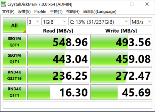 硬盘方面,这款笔记本搭载了M.2接口 SATA协议的固态硬盘,经过我们实际测试固态硬盘的顺序读取成绩为548.96MB/S,性能表现出色,能够实现秒进系统和应用秒打开,实际体验非常不错。