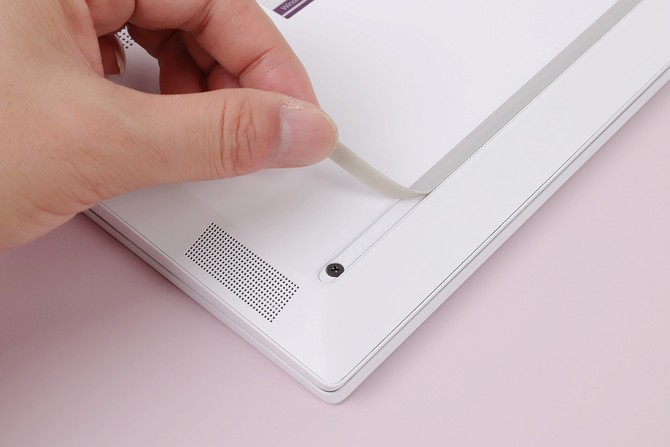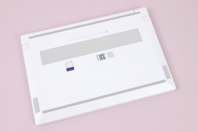 星13 Air轻薄本的D面同样是采用了镁铝合金材质材质,不仅极致轻薄,配色、手感都做到了一致性优雅。底部密集的小孔起到了通风作用,两侧的“小窗口”是音箱部分,上下两条防滑脚垫,可以很稳固的放在桌面或玻璃材质上。螺丝钉设计在防滑脚垫下,采用了隐藏式设计,所以整个D面的设计非常简约。