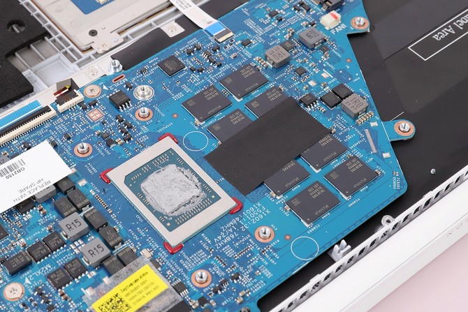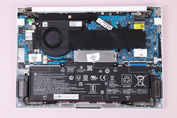 星13 Air轻薄本内部看上去很紧凑,标志性惠普蓝主板,风扇和导热管占了主板一半的面积,中间铝片的下面是M.2接口的SSD,而内存采用了板载,可以大大节省内部空间,同时减轻重量。唯一不利的是后期无法再升级或更换,不过好在已经标配16GB双通道,3200MHz规格,几年内完全够用。