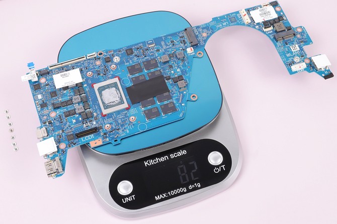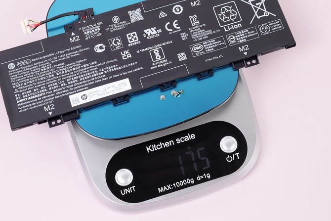 接下来我们就实测一下所拆卸配件的重量,哪些配件最轻?哪些最有分量?一眼就能明了。需要说明的是,由于电子秤存在的误差,以及部分部件、比如一颗螺钉,其单个重量无法精准测量,所以最终的综合重量与我们前面测的整机重量也就存在误差,但主要的部件,已经足够我们了解到这款惠普星13 Air轻薄本的“轻”之所在。
