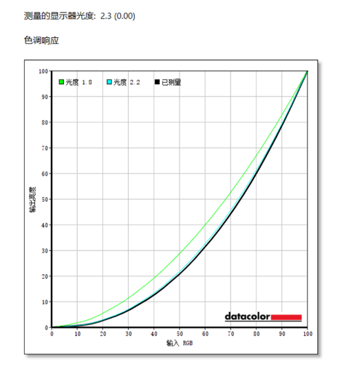 测量的显示器光度为2.3,色调响应曲线,已测量曲线跟推荐光度2.2曲线几乎完全重合,同样相当不错的素质表现。