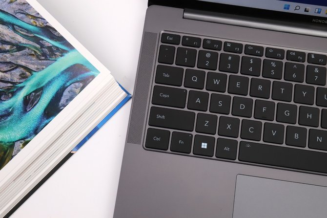 市场上的确有更加轻薄的笔记本,但也同时牺牲了键盘打字的舒适度作为代价,这对于依赖于笔记本办公的朋友并不友好。荣耀MagicBook V 14在薄至14.9mm的机身上,还搭载了一个全尺寸背光键盘,并且提供1.5mm超长键程、19.05mm按键间距的设计,不得不说是充分考虑了用户使用笔记本打字时的痛点。毫无疑问,更长的键程带来了绝佳的打字体验。此外,除了取消键盘区上的隐藏式摄像头,电源/指纹识别二合一按键得以保留,用户可以选择双摄人脸设别,还可以选择指纹登陆,不仅快捷,还多一份安全。