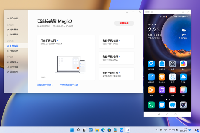 在手机与PC的互联互通方面,荣耀可以算是最早将两者无缝快捷连接的品牌之一。此次跟微软的深度合作,以及全新一代Windows 11的优化,荣耀MagicBook V 14更是将多屏协同发挥到极致,这包括与荣耀手机、平板、笔记本、智慧屏等终端的连接,变的更加紧密和融合。