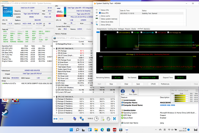 此外也可以看到,荣耀MagicBook V 14将i5-11320H CPU PL1设定为45W,PL2达到了64W功耗,比基础的35W TDP更为激进。当然,PL1和PL2设定只是理论设置,处理器能够以多少功耗运行,会受到主板供电及散热能力的直接影响。