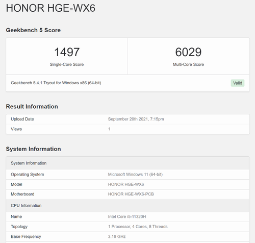 Geekbench 5是一款比较常用的跨平台CPU性能测试软件,能够模拟各种复杂的办公场景并进行评估给出其在单核、多任务处理方面的成绩。在荣耀笔记本上,这款酷睿i5-11320H单线程跑分为1497、多线程跑分为6029。