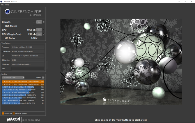 Cinebench主要评测CPU在图形渲染方面的计算能力,在Cinebench R15的测试中,单核成绩216cb,多核成绩1056cb;R20的测试中,单核成绩562pts,多核成绩2553pts;R23的测试中,单核成绩1465pts,多核成绩6446pts。同样均优于同门兄弟的酷睿i5-11300H。