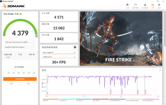Fire Strike测试的显卡得分4571,物理得分15082,综合得分4379。1440分辨率下的帧率30+FPS。
