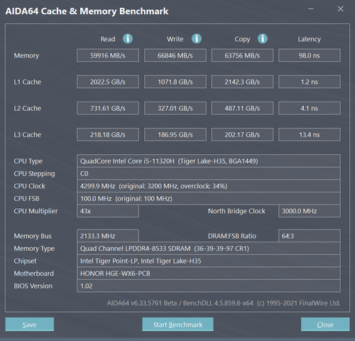 我们评测的这款荣耀MagicBook V 14搭载了16GB LPDDR4x 4266MHz双通道内存,相比3200MHz的传输速率提升33%。使用AIDA64的内存检测,读取速度59916MB/s,写入速度66846MB/s,时延98ns,达到旗舰级水准。