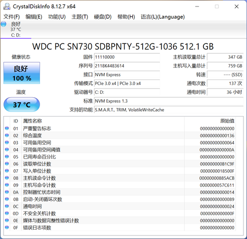对于传统的机械硬盘来说,SSD有更快的数据传输速度、更大容量、更小体积等优点,而且现在成本也不比HDD贵很多,所以已经成为PC主流储存。这款笔记本搭载了一块WDC西数SN730 SSD,512GB容量,NVMe接口,传输模式为PCIe 3.0×4。