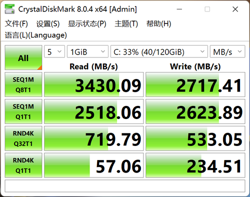 使用CrystalDiskMark检测,顺序读取的速度为3430MB/s,写入速度为2712MB/s。能够满足系统快速启动、大文件数据传输的需求。