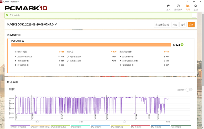 PCMark 10能够评估整机的综合性能,通过模拟多种办公应用、视频会议等的场景给出具体的成绩。在现代办公模式下,包括常用基本功能、生产力、数位内容创作等项目,并给出很详细的得分,荣耀MagicBook V 14在办公应用方面的优势更大。