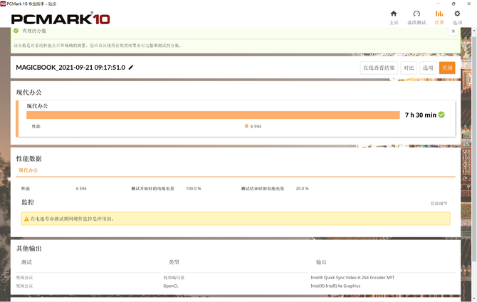 我们将系统电源设定为最佳电源效率,电脑管家电源模式为平衡,屏幕亮度调整至80%,关闭键盘背光,保持无线、蓝牙等的基础设置,充电至100%满电,运行PCMARK 10的现代办公场景电源测试,最终成绩为7小时30分钟,系统电源剩余20%,如果全部耗尽,超过10小时的续航是没有问题的。