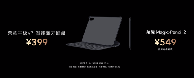 由于该产品已经上市开售,这里首先说一下版本与售价,荣耀平板V7提供了三个存储组合,其中,6GB+128GB WiFi版售价1999元;8GB+128GB WiFi版售价2299元;6GB+128GB 5G版售价2599元。HONOR Magic-Pencil2和专属智能蓝牙键盘,分别售价为549元、399元。近期想要入手平板电脑的朋友,可前往荣耀官网和各大电商购买。