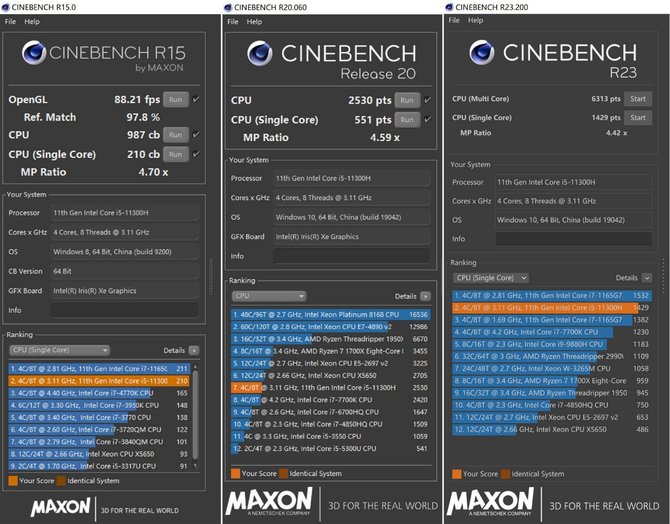 在CINEBENCH R15的测试中,i5-11300H处理器在无畏Pro14 酷睿版上的单核得分为210cb,多核得分987cb;R20测试单核得分551pts,多核得分2530pts;R23测试单核得分1429pts,多核得分6313pts。