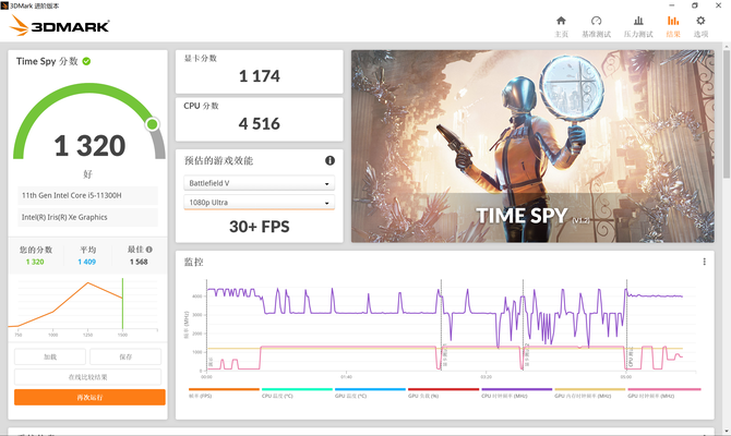 最新版3DMark的测试中,Time Spy测试综合得分1320,显卡分数1174,CPU分数4516,《战地V》1080P下的参考为30+FPS。