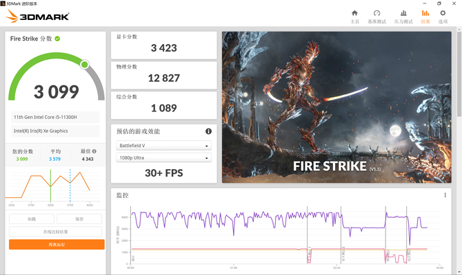 Fire Strike综合得分3099,显卡得分3423,物理分数12827。