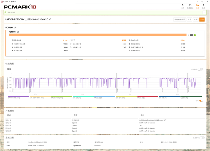 PCMark 10是比较常用的整机性能测试软件,现代办公模式,常用基本功能包括了应用程序启动、视频会议和网页浏览,综合得分8916;生产力包括了电子表格和文档编写,综合得分6580;数位内容创作包括照片编辑、视觉与渲染化、视频编辑,综合得分为5109,结果令人满意。