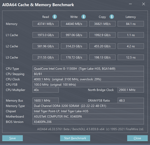 在内存方面,H35系列处理器可以支持DDR4 3200MHz或4266MHz LPDDR4/X规格的内存。这款无畏Pro14 酷睿版采用的是16GB DDR4 3200MHz双通道,测试读取速度为43741MB/s,写入速度44040MB/s,Copy速度36821MB/s,时延仅为84.1ns,综合性能达到主流偏上的水平。