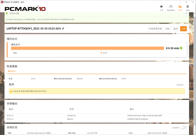 续航时间方面,华硕无畏Pro14 酷睿版内置了一块63Wh的大容量电池,加上CPU优化、OLED功耗更低等的特性,使得这款笔记本在续航时间方面同样足够优秀。在测试续航时间时,我们关闭了键盘背光,系统性能为更长的续航,屏幕亮度调低至50%可正常使用,之后使用PCMARK 10的现代办公模式连续测试,最终获得将近9小时的续航,笔记本剩余3%电量自动关机。这样的续航可以满足一整天的使用。