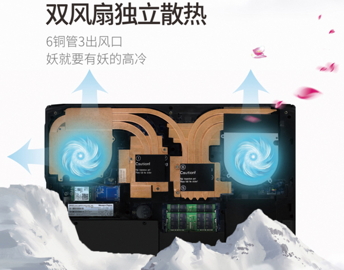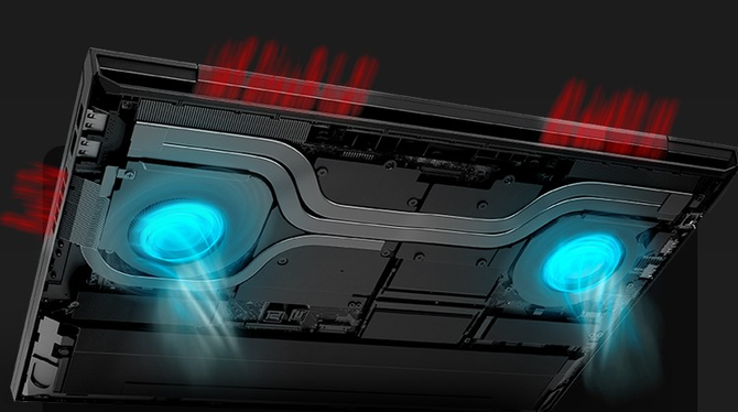 散热方面,采用的冰川散热架构2.0,搭配底面进风口,进风量更会有着30%左右的提升。同时搭配5热管双风扇4出风口,液态金属导热以及超大面积的散热鳍片,可以轻松驾驭一套顶级配置满载工作时的发热。