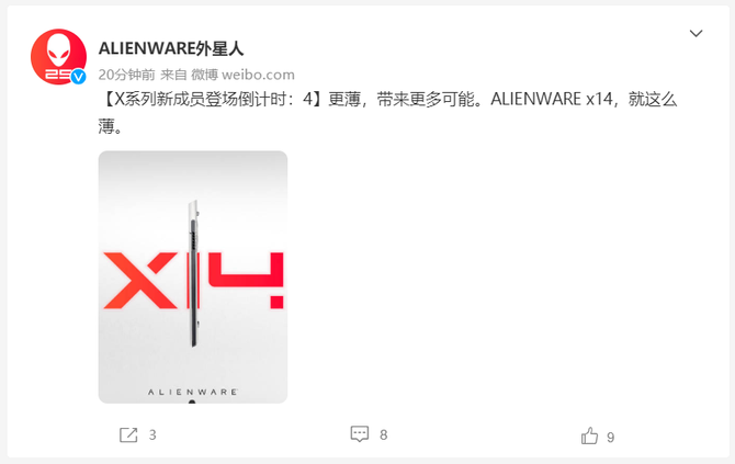 1月20日,@ALIENWARE外星人 今天宣布了【X系列新成员登场倒计时:4】的预热消息,意味着再有4天将正式推出ALIENWARE x14轻薄笔记本。