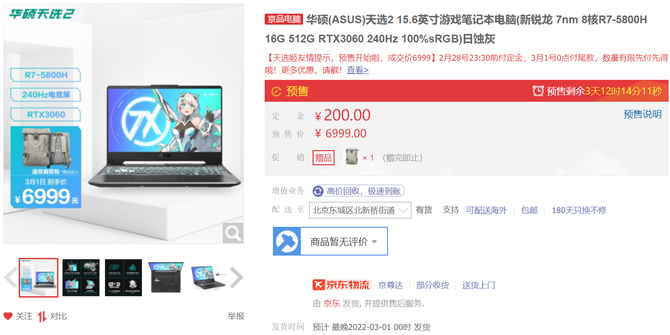 天选2游戏本目前已经在京东商城上架预售,现在支付200元定金,3月1日支付尾款,到手价仅6999元,即可立即尝鲜体验了。