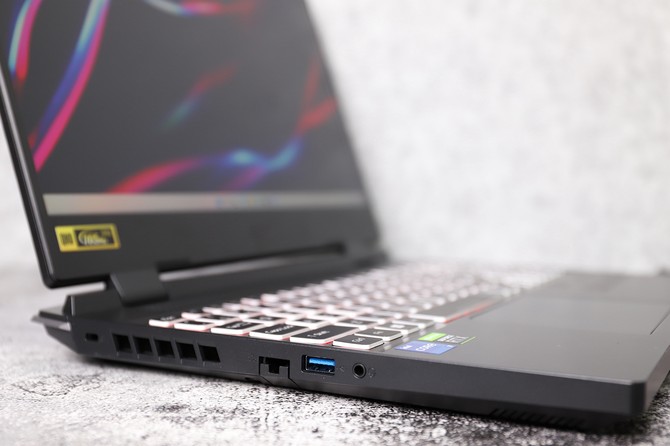 机身左侧靠近后部的是散热栅格,此外还有一个RJ45有线网口,一个USB 3.,2 Gen 2接口,以及1个3.5mm耳机、麦克风二合一音频接口。