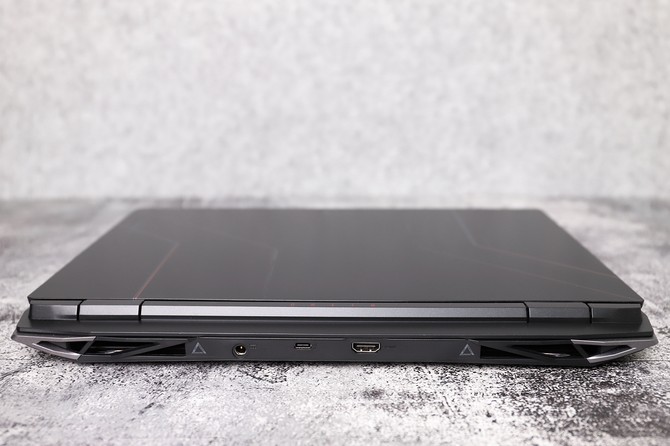 随着外观模具的改变,暗影骑士 · 擎 2022版的接口也进行了升级。机身后部左右两端是散热出风口,此外提供了一个圆形电源接口,配备230.1W电源适配器,能够满足整机满功耗运行。此外还有一个雷电4接口,一个HDMI 2.1接口,在连接外设显示器时可实现独显直连。
