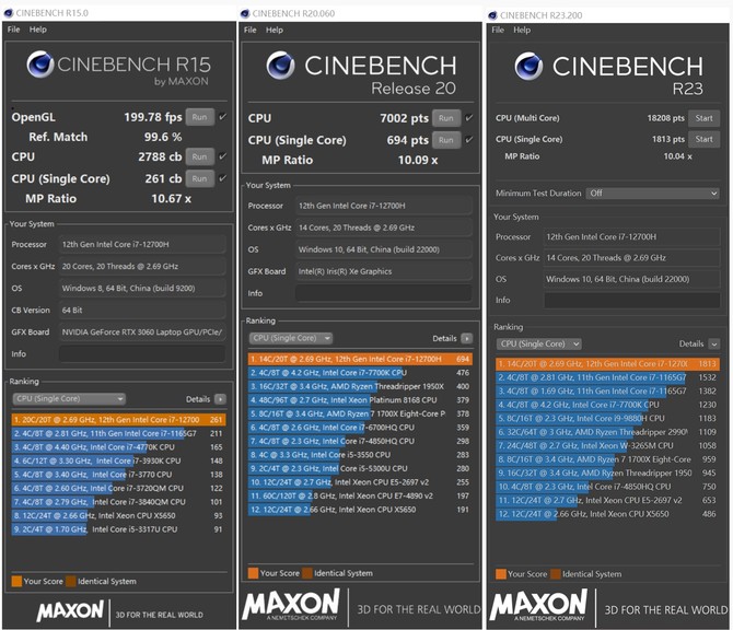 CINEBENCH R15单核性能261cb,多核性能2788cb;R20单核性能694pts,多核性能7002pts,R23单核性能1813pts,多核性能18208pts。